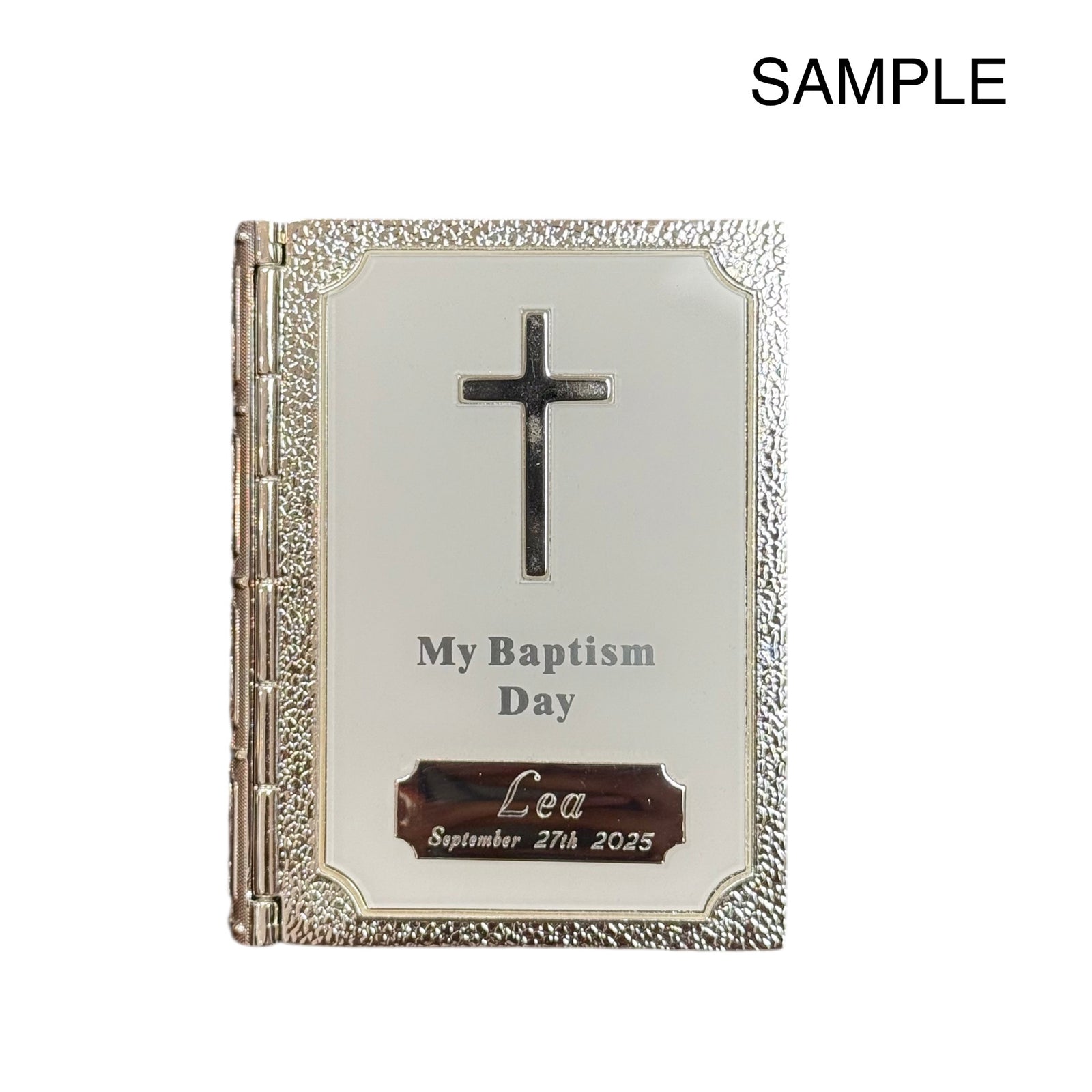 Celebrate and cherish the memory of a special baptism day with this beautifully designed silver keepsake box. Shaped like a miniature book and detailed with a cross and “My Baptism Day” inscription, it opens to reveal a deep navy velvet-lined interior perfect for storing precious mementos. A blank engraving plate on the front allows for personalized names or dates, making it an ideal gift for babies, godchildren, or baptism ceremonies. A meaningful keepsake for a lifelong memory.