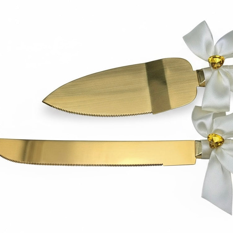 Celebrate life’s sweetest moments with our Gold Wedding Cake Knife and Server Set, featuring crystal-clear handles, ivory satin ribbons, and gold accents for a timeless, elegant look. Perfect for weddings, anniversaries, engagements, or as a personalized wedding gift, this set adds sophistication to every cake-cutting moment.
