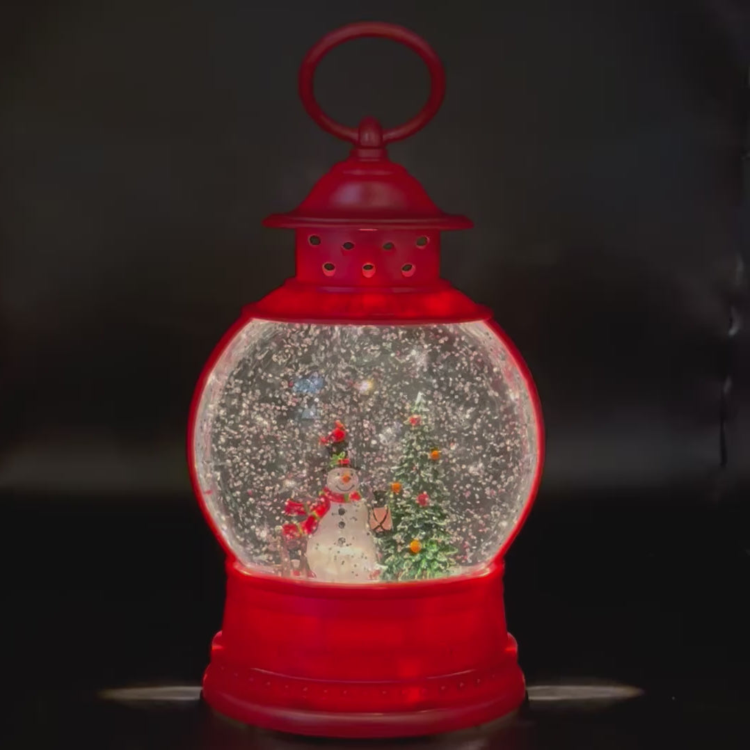 Christmas Lantern Snow Globe | Red LED Holiday Lantern | Spinning Glitter | Snowman & Christmas Tree Décor