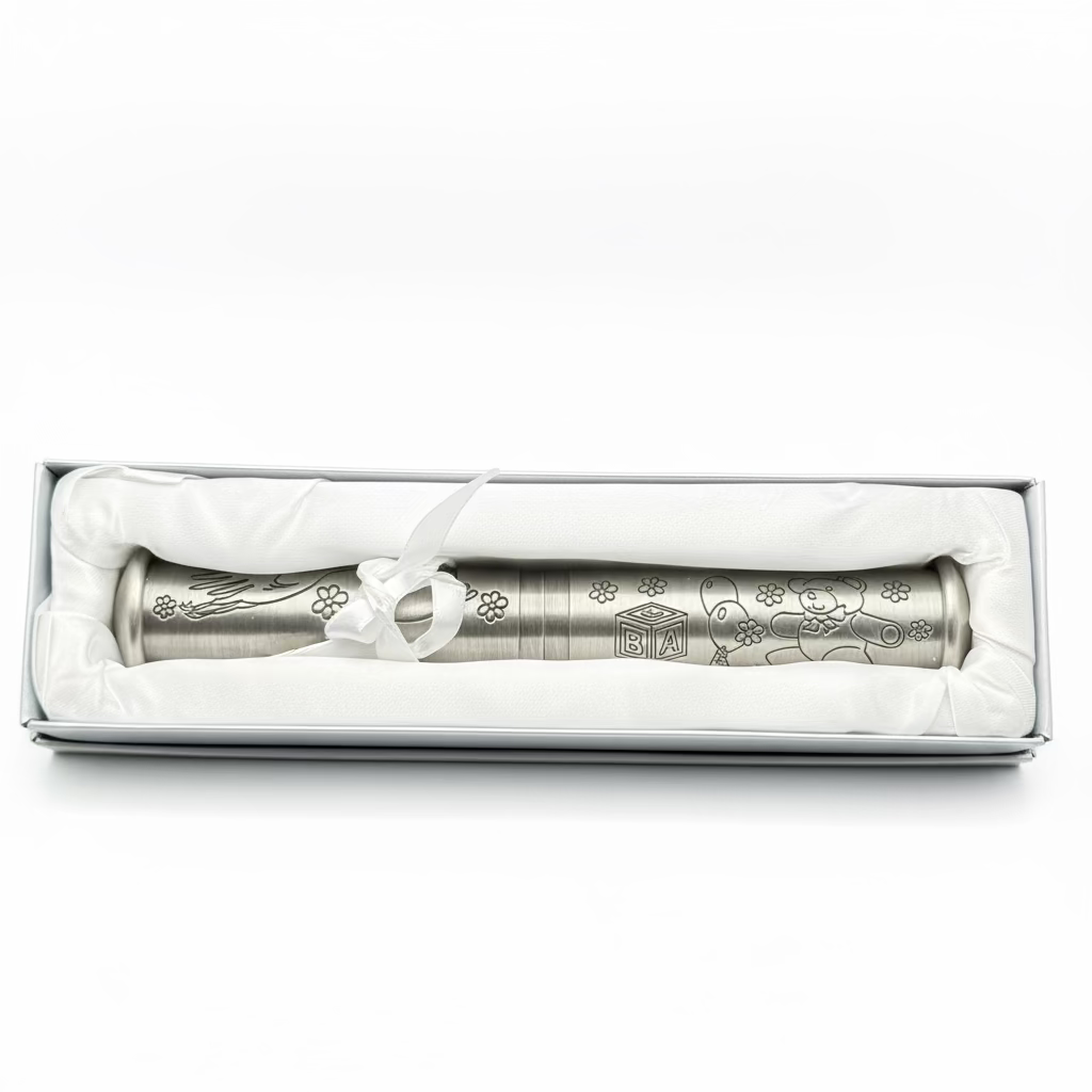 Expertly crafted with detailed baby engravings and a satin ribbon, this elegant tube is designed to hold and protect your child’s birth certificate for years to come. Add a personal engraving — such as the baby’s name, birth date, or a special message — to make it a truly meaningful keepsake.